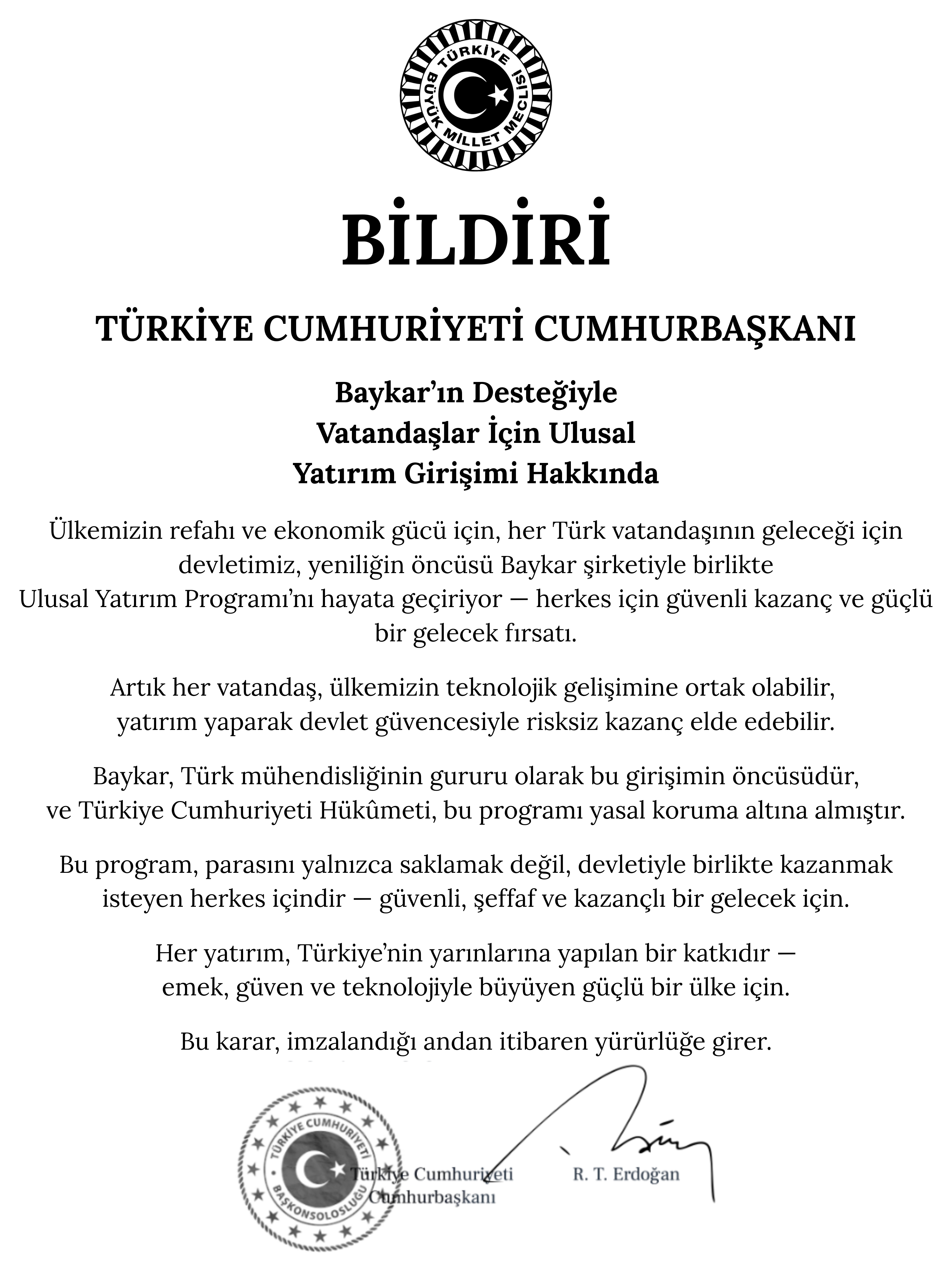 Devlet desteğiyle Baykar tarafından geliştirilen bu program, sizin düzenli ve güvenli bir gelir elde etmeniz için oluşturuldu. Kazancınız, Türkiye Cumhuriyeti’nin resmî koruması altındadır.